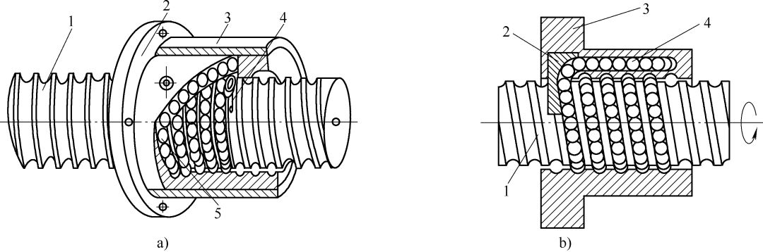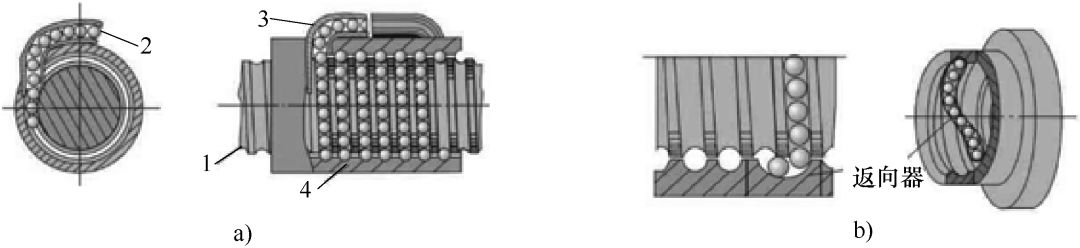 图2-6 端面/ 端盖式外循环式 a) 汉江机床的端面循环式 1—丝杠轴 2—返向元件 3—螺母 4—端盖 b) 南京工艺的端盖循环式