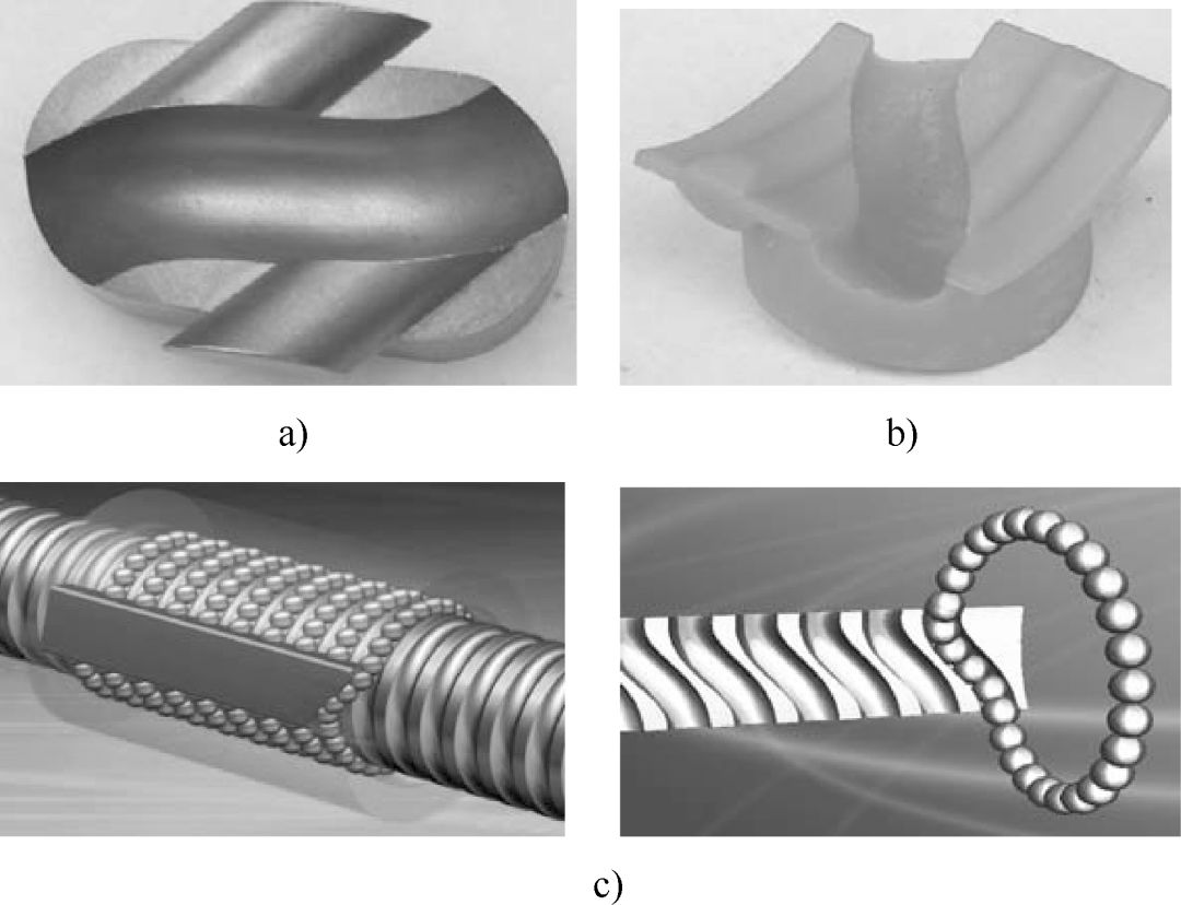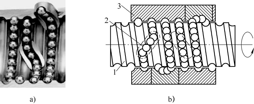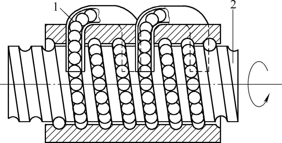 滚珠循环方式按滚珠在循环反向过程中与丝杠表面脱离与否, 可分为内循环式和外循环式, 如图1 所示。 图1 滚珠循环方式 a) 外循环式 b) 内循环式 1—丝杠 2—滚珠 3—回珠管 4—螺母 1 内循环式 滚珠在循环过程中始终不脱离丝杠表面的循环方式, 称为内循环式, 如图2 所示。在螺母的侧孔内, 装有接通相邻滚道的返向器(或称回珠装置)。借助于返向器上回珠槽的作用, 迫使滚珠沿滚道滚动, 翻越丝杠螺纹滚道牙顶后, 重新回到初始滚道, 构成了一个循环的滚珠链(即为一个列), 故又称为单圈内循环。滚珠链通常有3 ~ 6 列, 即一个螺母上装有3 ~ 6 个返向器。为使滚珠螺母的结构紧凑, 这些返向器沿螺母圆周均匀分布, 返向器分别沿螺母圆周方向互错120°、90°、72°或60°。 图2 内循环式 a) 内循环实物示意图 b) 内循环原理示意图 1—丝杠轴 2—返向器 3—螺母 根据返向器的定位方式, 可分为固定式和浮动式两种。浮动式返向器结构特点是: 返向器与滚珠螺母上的安装孔保持有0. 01 ~0. 015mm 的配合间隙。在返向器外圆弧上加工有对称圆弧槽, 槽内安装拱形片簧。借助于片簧的弹力, 给返向器一个径向推力, 使位于回珠槽内的滚珠始终与丝杠表面保持一定的压力, 这样, 槽内滚珠就代替了定位键而对返向器起到自定位作用。浮动式返向器的优点在于高频“浮动” 中实现回珠槽进出口的自动对接, 从而为滚珠返回提供流畅的通道口, 因而具有较好的摩擦特性和结构工艺性, 装配简便, 在高速运转中工作可靠。这种返向器适用于各种高灵敏度、高刚度要求的精密进给系统, 但不适用于重载、多线滚珠丝杠副, 以及大导程、小导程的滚珠丝杠副。浮动式返向器滚珠丝杠副是目前较有发展前途的结构形式, 并且正在逐渐取代固定式返向器的滚珠丝杠副。 根据返向器的结构形式, 可分为扁圆形返向器、圆形(又称凸键形) 返向器和矩阵形(又称多列阵) 返向器, 如图3 所示。扁圆形返向器的结构类似一个扁圆腰子形镶块, 紧固或焊接在螺母上的扁圆孔中, 其优点是轴向尺寸短, 可有较多圈数, 承载能力较高, 且结构紧凑美观, 缺点是扁圆孔的加工、测量较难, 且精度不易保证, 装卸也较麻烦; 圆形返向器的两个对称键、键槽对称精度以及深度均需控制, 制造工艺性较差, 其余部分加工则较扁圆形有较大改善, 但仍存在轴向尺寸大、装配较困难等缺点; 矩阵形返向器的相邻螺纹通过条状的循环装置形成一个滚珠循环链, 多个滚珠链共用一个返向装置。其结构紧凑, 没有无效圈, 同等长度下承载圈数最高,同等导程下钢球直径可设计至最大。 图3 返向器结构形式 a) 扁圆形 b) 圆形 c) 矩阵形 内循环式结构设计简单, 螺母外径小, 可进行微型设计, 满足最小空间安装, 装配简便, 适于批量生产; 滚珠运行阻力相对较小, 起动容易, 滚珠流畅性好, 灵敏度较高; 摩擦损失少, 传动效率较高; 滚珠回程较短, 刚度较好, 运转精度较高。但返向器回珠槽为空间曲面, 呈S 形, 加工较困难, 对滚珠丝杠副的公称直径、丝杠外径、螺纹滚道牙形与接触角、牙顶圆角(保证圆滑过渡) 等加工要求亦较高, 不便于多滚道设计, 且丝杠一端螺旋沟槽须贯穿, 肩部轴径尺寸须小于沟槽底径, 否则无法组装螺母。此类丝杠适用于中小导程、中低速度场合, 如3D 打印机、中小型医疗扫描仪等。 2 外循环式 滚珠在循环返回时离开了丝杠螺旋滚道而在螺母体内或体外循环, 即称为外循环式。外循环式滚珠丝杠副尺寸较大, 适用于载荷较大的场合, 如大型重载机床。外循环式有若干条闭合的滚珠链, 由于回珠孔占去圆周的1/4, 两端孔共占1/2, 故一列滚珠链最多0. 5 圈。根据结构工艺, 可使用的工作圈数为1. 5 圈、2. 5 圈或3. 5 圈, 最多不超过4. 5 圈。此外还可以配置多列结构, 如圈和列的配合(即圈数× 列数) 可表示为1. 5 × n、2. 5 × n, 最常用的结构是1. 5 ×2、2. 5 ×2 和3. 5 ×2 这三种配合。外循环滚珠丝杠副按其在滚珠返回装置构造的不同, 可分为套筒-螺旋槽式、插管式和端面/ 端盖式三种: (1) 套筒-螺旋槽式。在滚珠螺母外圆柱面上加工有螺旋形凹槽作为滚珠循环通道, 凹槽的两端分别加工有与螺旋滚道相切的通孔, 将两个挡珠器(端部导流器) 装于螺母内表面侧孔中, 弧形挡珠杆与螺旋滚道相吻合, 杆端部舌形部分将引导滚珠进入回珠通孔, 返回初始螺旋滚道, 形成滚珠链运动。为防止滚珠从回珠槽内脱出, 用套筒紧套在螺母外圆柱上, 从而构成了滚珠链的封闭循环运动, 即套筒-螺旋槽式外循环, 如图4 所示。 图4 套筒-螺旋槽式外循环式 a) 套筒-螺旋槽式外循环三维示意图 1—丝杠 2—螺母 3—套筒 4—挡珠器 5—滚珠 b) 套筒-螺旋槽式外循环截面图 1—丝杠轴 2—端部导流器 3—螺母 4—滚珠循环孔 这种形式结构简单, 螺母外径较插管式小20% ~ 30%, 轴向排列紧凑, 节约空间; 有效负载滚珠多, 承载能力较高; 刚度大, Dn 值最高可达18 万; 运行噪声低。与单圈内循环式相比, 该方式工艺性好, 生产不受批量限制, 且单、双列结构均可采用。一般情况下, 单列优于双列, 只有当单列螺母上工作圈数超过3. 5 圈时才用双列; 而双螺母预紧时, 最好以两圈为列(即2. 5 ×1), 但此时在一列中的滚珠数比其单圈内循环多, 即滚珠运动链长, 运行阻力增大, 且在螺母体上的回珠槽与回珠孔不易准确平滑连接, 拐弯处曲率半径小, 滚